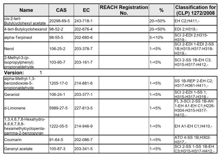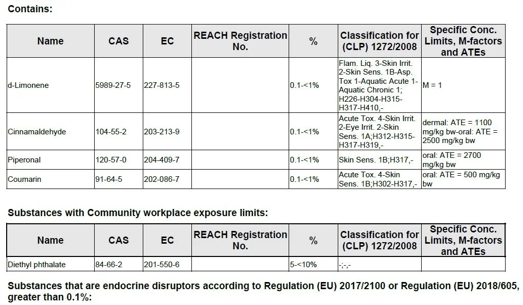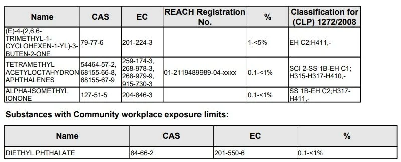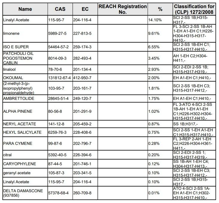 Please find content of all fragrance oils for allergen purposes below - Safety Data Sheets can be issued upon request - please contact us directly.